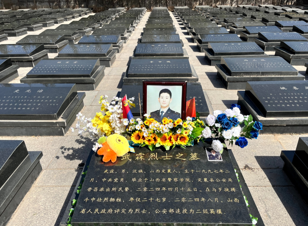 2024年4月15日,在山西省忻州市定襄縣寬溝村附近的山坡上,定襄縣公安局晉昌派出所民警武霖在轄區(qū)依法對一身份可疑男子進行核查的過程中,突遭對方持刀襲擊,經(jīng)全力搶救無效,27歲的青春定格在了鮮花滿坡的春天。(新華社記者萬倩儀、樊欣陽)