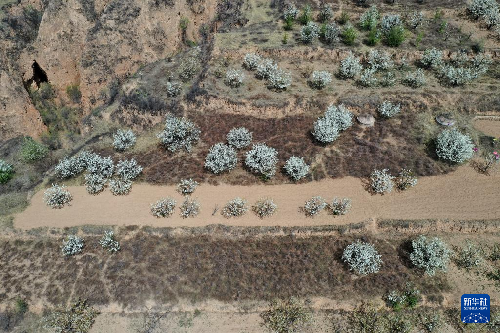 山西省原平市同川镇梨园内梨花盛开(4月17日摄,无人机照片)。