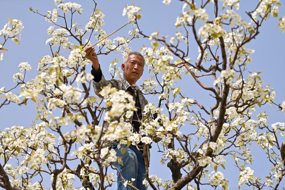 4月17日,在山西省原平市同川镇,果农给梨花授粉。