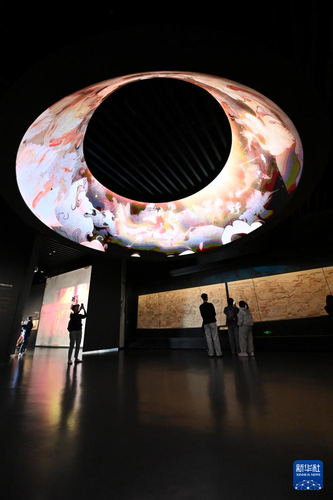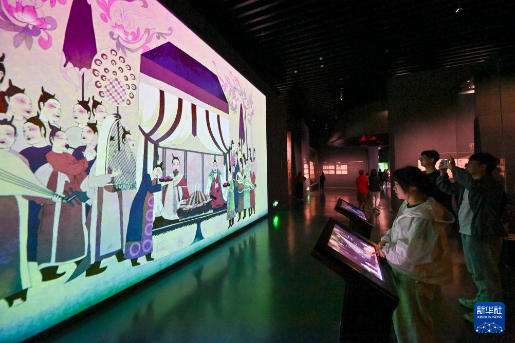 5月17日,在太原北齐壁画博物馆,游客通过多媒体设备和数字壁画互动。