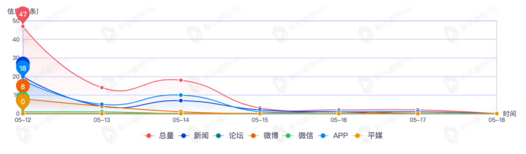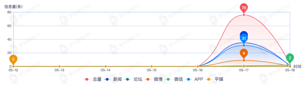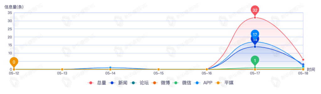 截至目前,該文章在互聯(lián)網(wǎng)上傳播總量共39篇。其中,5月17日是傳播的高峰期,共傳播32篇文章。各信源的信息發(fā)布情況中,APP信息占比最大,其次是新聞和微信,信息量分別為20、17、2,占比分別為51.28%、43.59%、5.13%。(數(shù)據(jù)來源:新華睿思·數(shù)媒智慧分析平臺)