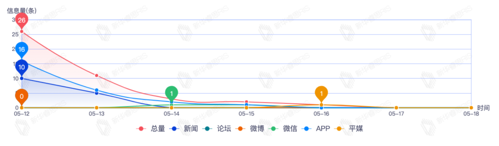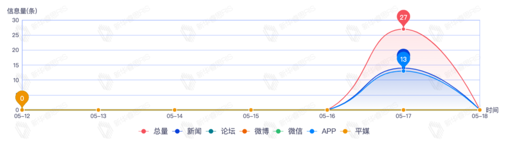 截至目前,該文章在互聯(lián)網(wǎng)上傳播總量共27篇。其中,5月17日是傳播的高峰期,共傳播27篇文章。各信源的信息發(fā)布情況中,新聞信息占比最大,其次是APP,信息量分別為14、13,占比分別為51.85%、48.15%。(數(shù)據(jù)來源:新華睿思·數(shù)媒智慧分析平臺)