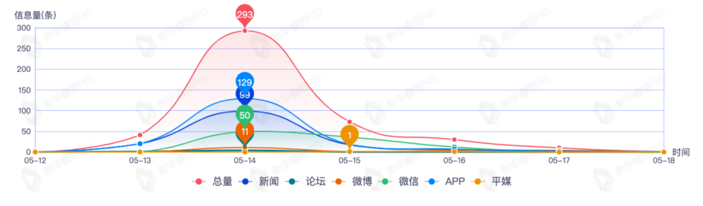 截至目前,該文章在互聯(lián)網(wǎng)上傳播總量共448篇。其中,5月14日是傳播的高峰期,共傳播293篇文章。各信源的信息發(fā)布情況中,APP信息占比最大,其次是新聞和微信,信息量分別為176、144、101,占比分別為39.91%、32.65%、22.90%。(數(shù)據(jù)來源:新華睿思·數(shù)媒智慧分析平臺)