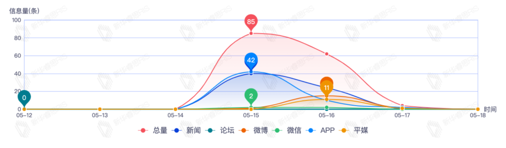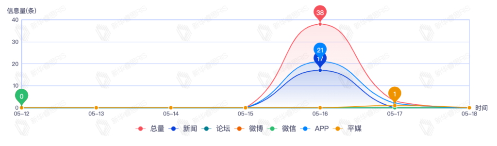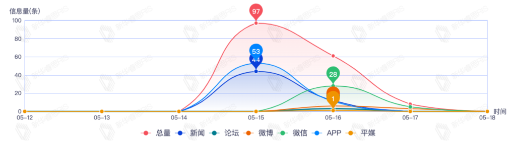 截至目前,該文章在互聯(lián)網(wǎng)上傳播總量共166篇。其中,5月15日是傳播的高峰期,共傳播97篇文章。各信源的信息發(fā)布情況中,APP信息占比最大,其次是新聞和微信,信息量分別為64、56、33,占比分別為38.79%、33.94%、20.00%。(數(shù)據(jù)來源:新華睿思·數(shù)媒智慧分析平臺)