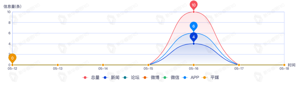 截至目前,該文章在互聯(lián)網(wǎng)上傳播總量共10篇。其中,5月16日是傳播的高峰期,共傳播10篇文章。各信源的信息發(fā)布情況中,APP信息占比最大,其次是新聞,信息量分別為6、4,占比分別為60.00%、40.00%。(數(shù)據(jù)來源:新華睿思·數(shù)媒智慧分析平臺)