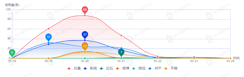 截至目前,該文章在互聯(lián)網(wǎng)上傳播總量202篇。其中5月20日是傳播的高峰期,共傳播88篇文章。各信源的信息發(fā)布情況中,新聞信息占比最大,其次是APP和平媒,占比分別為43.07%、38.61%、10.89%。(數(shù)據(jù)來源:新華睿思數(shù)據(jù)云圖分析平臺)