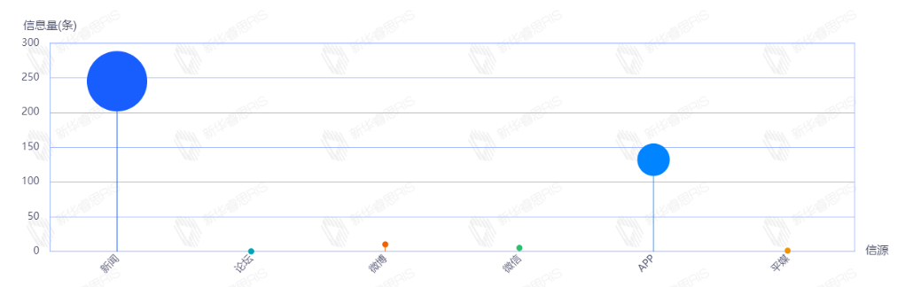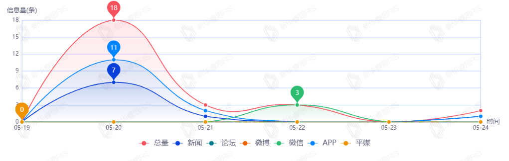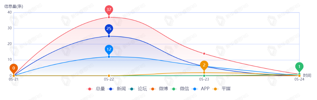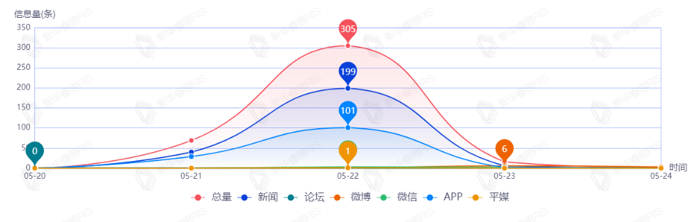 截至目前,該文章在互聯(lián)網(wǎng)上傳播總量393篇。其中5月22日是傳播的高峰期,共傳播305篇文章。各信源的信息發(fā)布情況中,新聞信息占比最大,其次是APP和微博,占比分別為62.34%、33.59%、2.54%。(數(shù)據(jù)來源:新華睿思數(shù)據(jù)云圖分析平臺)