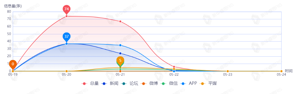 截至目前,該文章在互聯(lián)網(wǎng)上傳播總量147篇。其中5月20日是傳播的高峰期,共傳播74篇文章。各信源的信息發(fā)布情況中,APP信息占比最大,其次是新聞和平媒,占比分別為48.98%、42.18%、5.44%。(數(shù)據(jù)來源:新華睿思數(shù)據(jù)云圖分析平臺)