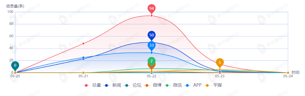 截至目前,該文章在互聯(lián)網(wǎng)上傳播總量156篇。其中5月22日是傳播的高峰期,共傳播94篇文章。各信源的信息發(fā)布情況中,新聞信息占比最大,其次是APP和微信,占比分別為48.72%、38.46%、7.05%。(數(shù)據(jù)來源:新華睿思數(shù)據(jù)云圖分析平臺)