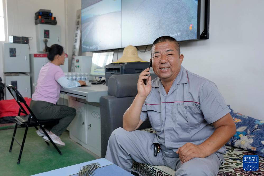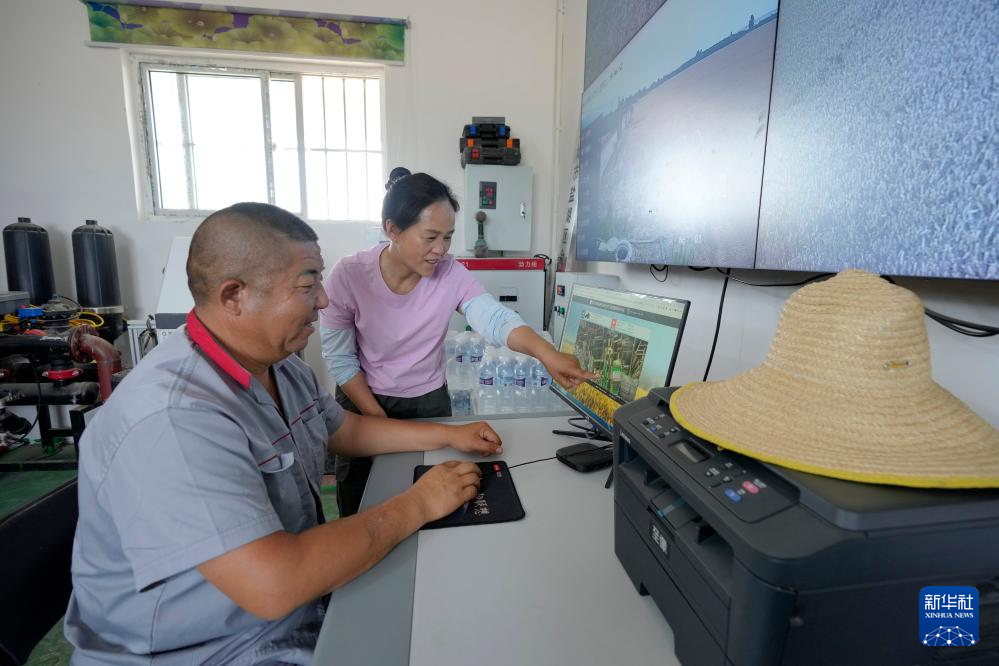 在山西省运城市盐湖区解州镇曲村,董会龙(左)和妻子范月亲通过农机精准作业平台查看农机手作业情况(5月27日摄)。