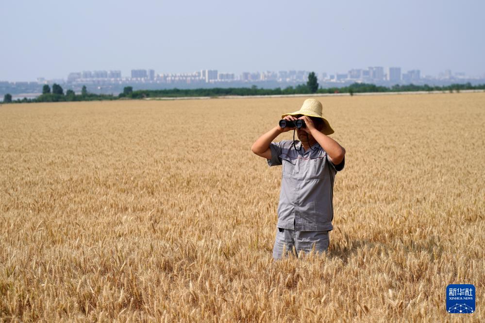 董会龙在山西省运城市盐湖区解州镇曲村麦田里查看小麦生长情况(5月27日摄)。