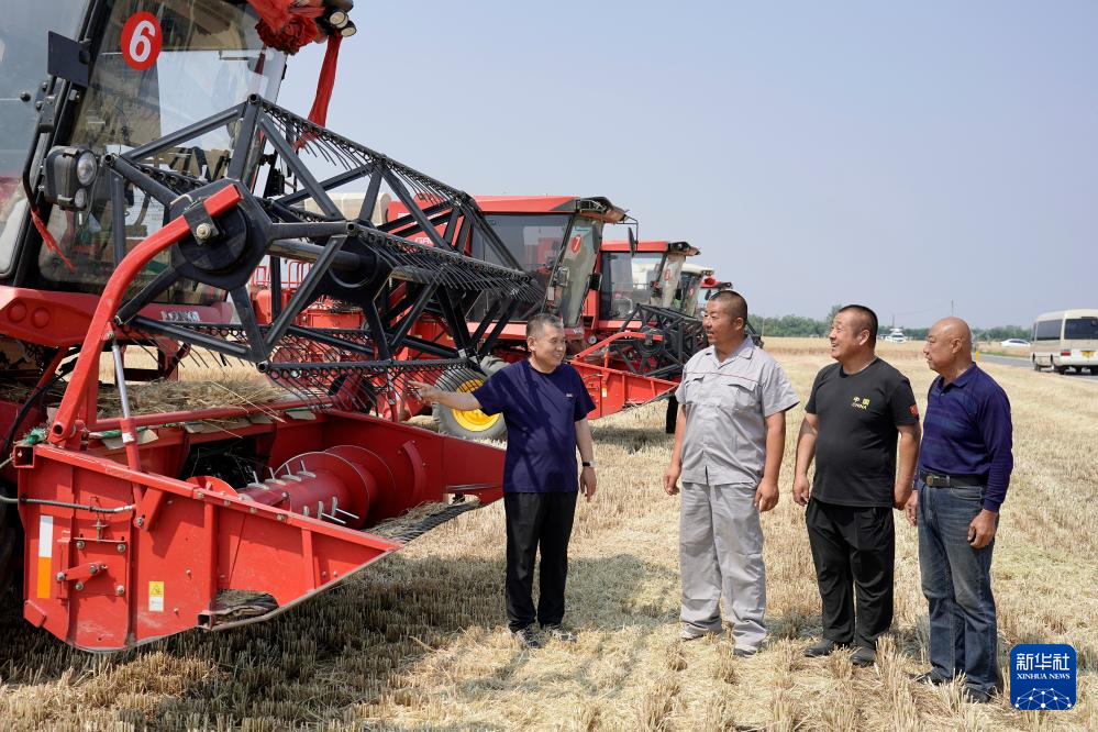 在山西省运城市盐湖区解州镇曲村的麦田里,董会龙(左二)和农机手沟通收割注意事项(5月28日摄)。