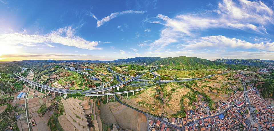 6月2日,左权县汾邢高速与天黎高速枢纽如巨龙蜿蜒,与太行梯田、苍翠山峦相映成画。两条交通动脉构成“十字形”枢纽,自通车以来,带动当地物流效率提升和乡村旅游发展。