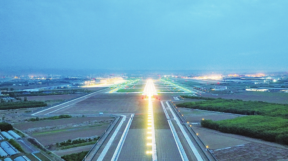 图为新建二跑道助航灯光亮灯。王轶玮摄