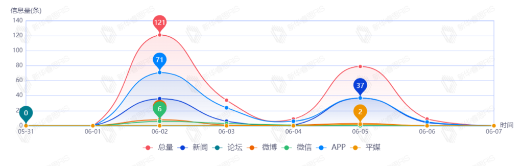 截至目前,該文章在互聯(lián)網(wǎng)上傳播總量共252篇。其中,6月2日是傳播的高峰期,共傳播121篇文章。各信源的信息發(fā)布情況中,APP信息占比最大,其次是新聞和微博,占比分別為55.51%、34.29%、5.31%。(數(shù)據(jù)來源:新華睿思·數(shù)媒智慧分析平臺(tái))