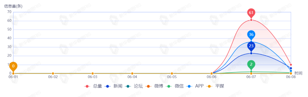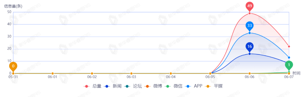 截至目前,該文章在互聯(lián)網(wǎng)上傳播總量共71篇。其中,6月6日是傳播的高峰期,共傳播49篇文章。各信源的信息發(fā)布情況中,APP信息占比最大,其次是新聞和微信,占比分別為58.33%、40.00%、1.67%。(數(shù)據(jù)來源:新華睿思·數(shù)媒智慧分析平臺(tái))