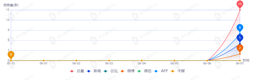 截至目前,該文章在互聯(lián)網(wǎng)上傳播總量共15篇。其中,6月7日是傳播的高峰期,共傳播15篇文章。各信源的信息發(fā)布情況中,新聞信息占比最大,其次是APP和微博,占比分別為41.67%、41.67%、16.67%。(數(shù)據(jù)來源:新華睿思·數(shù)媒智慧分析平臺(tái))