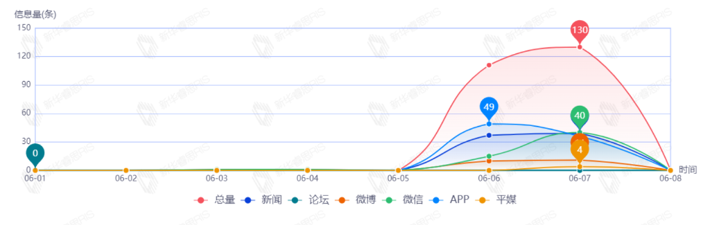 截至目前,該文章在互聯(lián)網(wǎng)上傳播總量共243篇。其中,6月7日是傳播的高峰期,共傳播130篇文章。各信源的信息發(fā)布情況中,新聞信息占比最大,其次是APP和微信,占比分別為33.93%、29.46%、25.45%。(數(shù)據(jù)來源:新華睿思·數(shù)媒智慧分析平臺(tái))