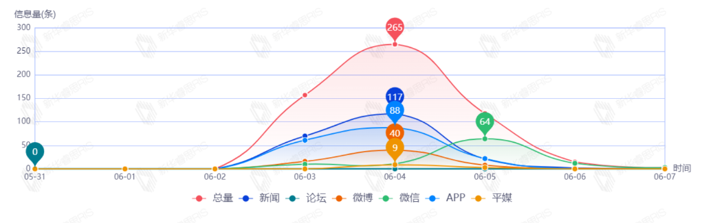截至目前,該文章在互聯(lián)網(wǎng)上傳播總量共558篇。其中,6月4日是傳播的高峰期,共傳播265篇文章。各信源的信息發(fā)布情況中,新聞信息占比最大,其次是APP和微信,占比分別為38.53%、28.99%、18.35%。(數(shù)據(jù)來源:新華睿思·數(shù)媒智慧分析平臺(tái))