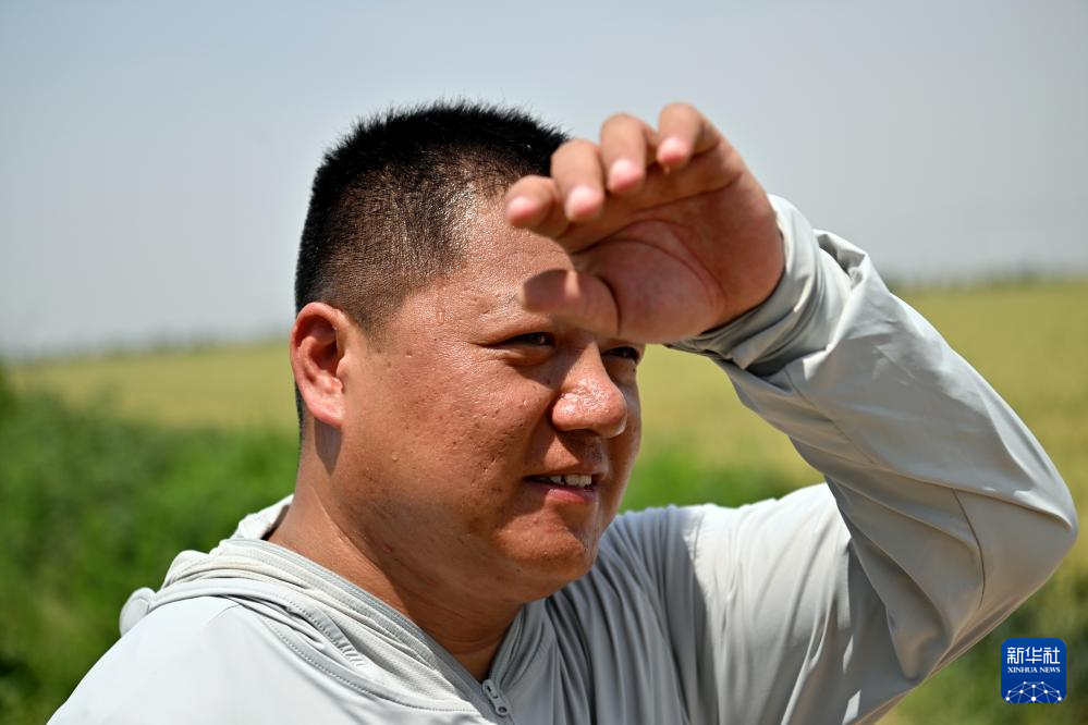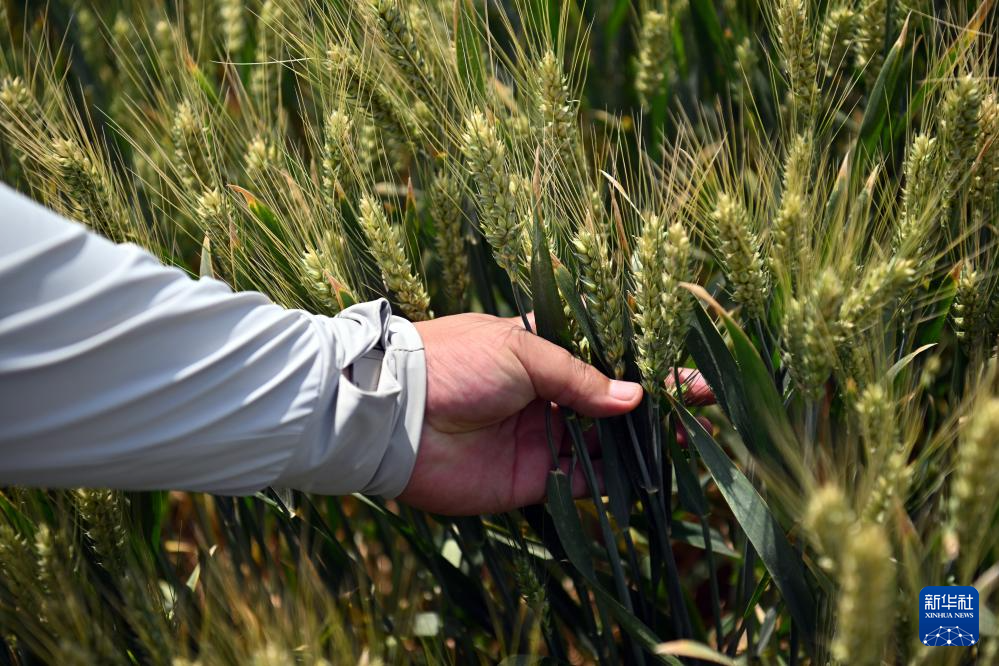 在永济市虞乡镇麦田里,贾俊杰查看小麦时擦去额头上的汗水(5月21日摄)。