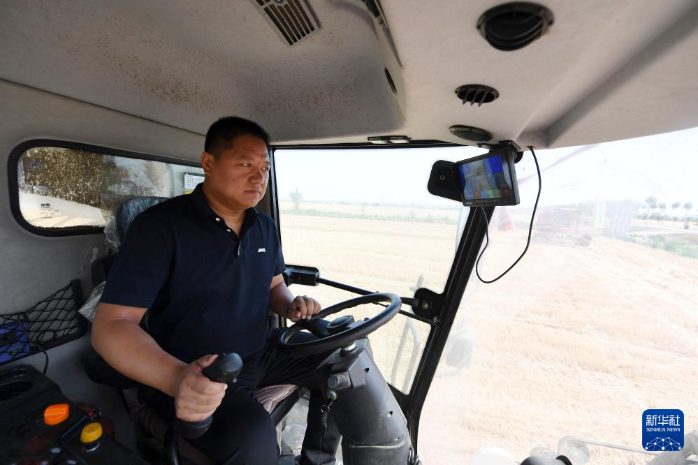 虞乡镇的麦田里,收割机开足马力驰骋,小麦被整齐切割、脱粒。临近中午,烈日灼人,贾俊杰和团队成员顾不上休息,登上收割机赶紧前往下一块麦田,继续夏收的“征程”。