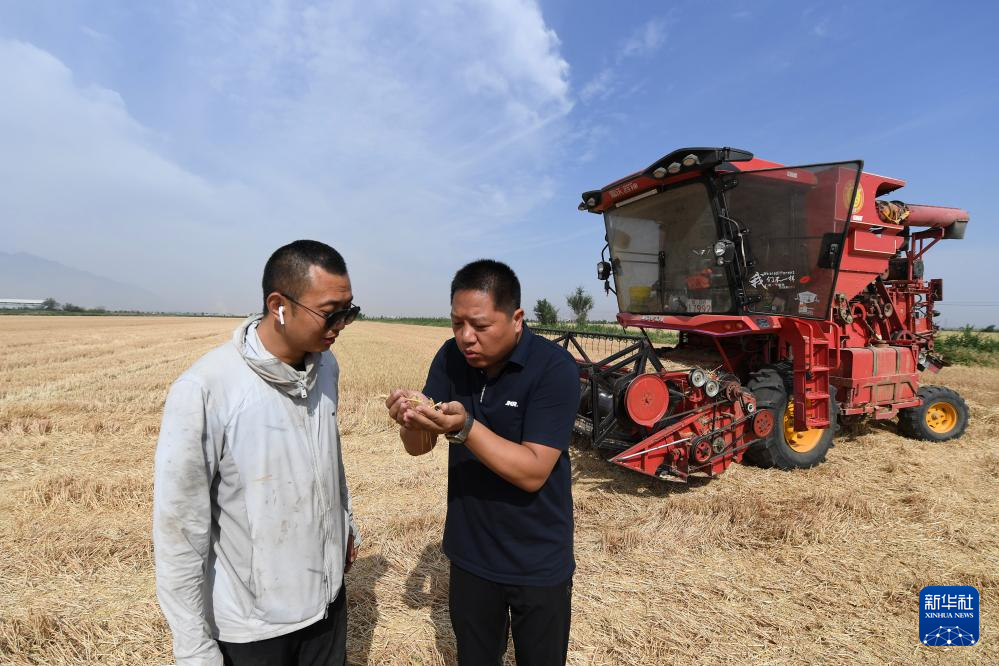 在永济市虞乡镇麦田里,贾俊杰(右)和农机手查看麦收情况(6月6日摄)。