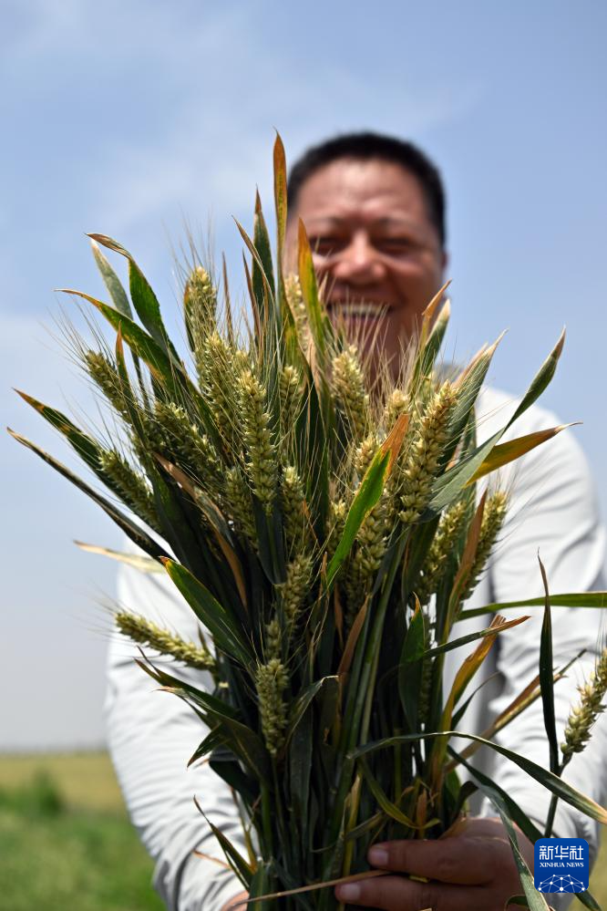 在永济市虞乡镇麦田里,贾俊杰展示沉甸甸的麦穗(5月21日摄)。
