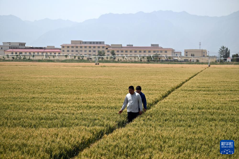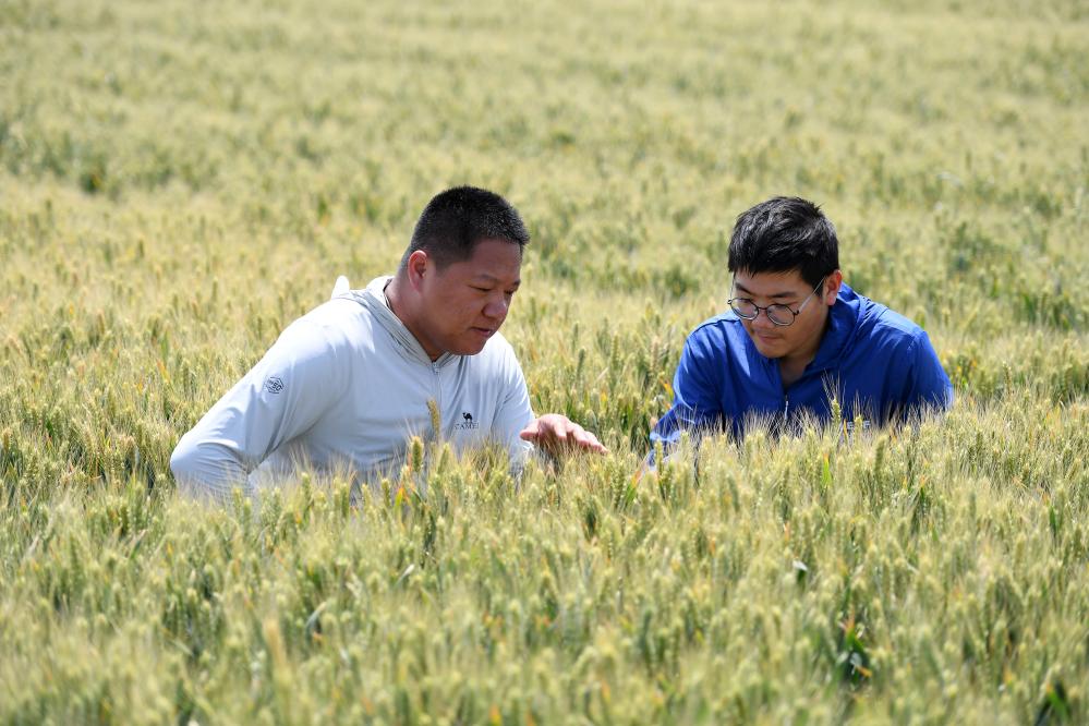 贾俊杰(左)和农业技术员在麦田里查看小麦生长情况(5月21日摄)。