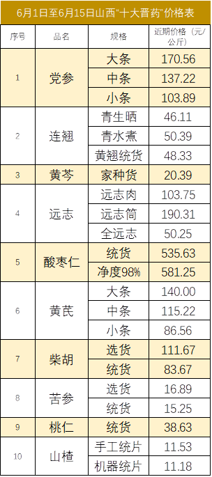 图3 6月1日至6月15日山西“十大晋药”价格表
