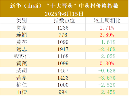 从细分指数来看,6月上半月山西“十大晋药”中药材价格指数三涨七跌。其中,潞党参报1236点,较上期上涨1.71%;连翘报776点,较上期上涨2.89%;黄芩报1099点,较上期下跌1.61%;远志报1917点,较上期下跌2.46%;酸枣仁报1168点,较上期下跌2.02%;黄芪报1099点,与上期上涨0.80%;柴胡报1457点,较上期下跌0.62%;苦参报1423点,较上期下跌3.57%;桃仁报1000点,较上期下跌2.52%;山楂报994点,较上期下跌2.45%。