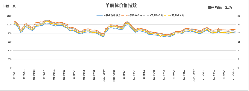 6月15日,羊胴体价格指数报811.83点,较上期上涨0.34%,A级胴体价格报22.08元/斤,较上期下跌0.11元/斤,跌幅0.48%;B级胴体价格报21.37元/斤,较上期上涨0.30元/斤,涨幅1.43%;C级胴体价格报20.65元/斤,较上期下跌0.13元/斤,跌幅0.65%。