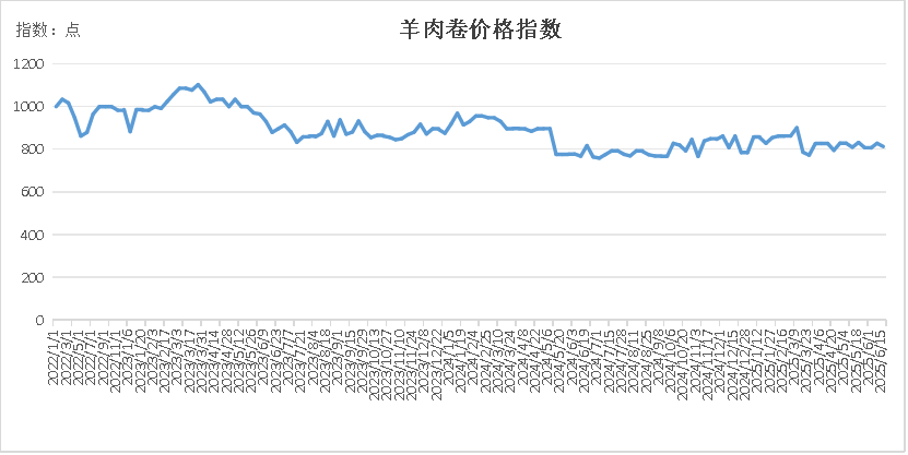 6月15日,羊肉卷价格指数报812.93点,较上期下跌1.87%,价格报47.15元/公斤,较上期下跌0.90元/公斤。