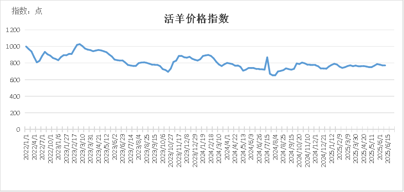 6月15日,活羊价格指数报769.43点,较上期下跌0.32%,价格报11.04元/斤,较上期下跌0.03元/斤。