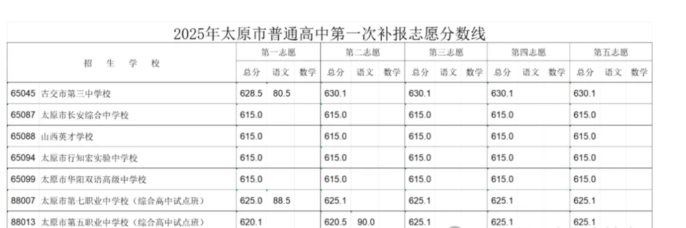太原市长安综合中学校、山西英才学校、太原市行知宏实验中学校、太原市华阳双语高级中学校、阳曲县高级职业中学校(综合高中试点班)第一志愿均为615分。太原市第五职业中学校(综合高中试点班)第一志愿620.1分。太原市第七职业中学校(综合高中试点班)第一志愿625分,语文成绩88.5分。古交市第三中学校第一志愿628.5分,语文成绩80.5分。(张晓丽)