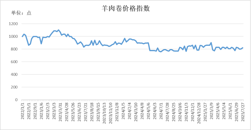7月27日,羊肉卷价格指数报821.55点,较上期上涨2.58%,价格报47.65元/公斤,较上期上涨1.20元/公斤。