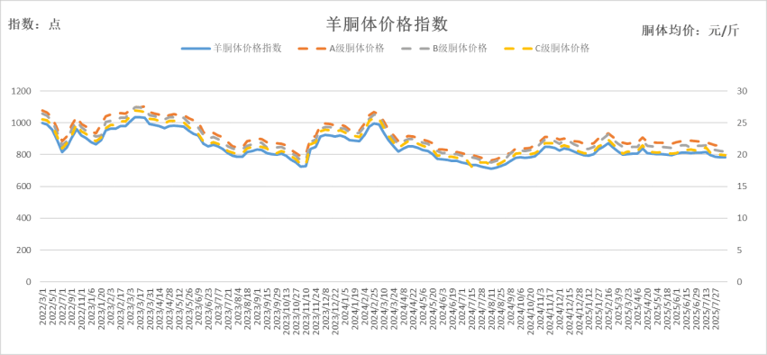 7月27日,羊胴体价格指数报782.61点,较上期下跌0.27%,A级胴体价格报21.46元/斤,较上期持平;B级胴体价格报20.49元/斤,较上期下跌0.10元/斤,跌幅0.48%;C级胴体价格报19.92元/斤,较上期下跌0.05元/斤,跌幅0.26%。