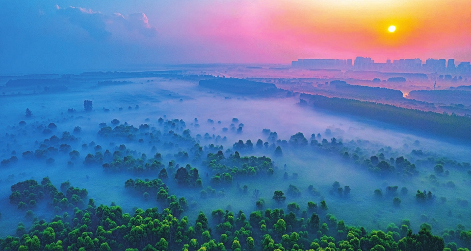 8月3日清晨,长治市漳泽湖国家城市湿地公园出现云海景观,从空中俯瞰,如梦似幻,十分壮观。