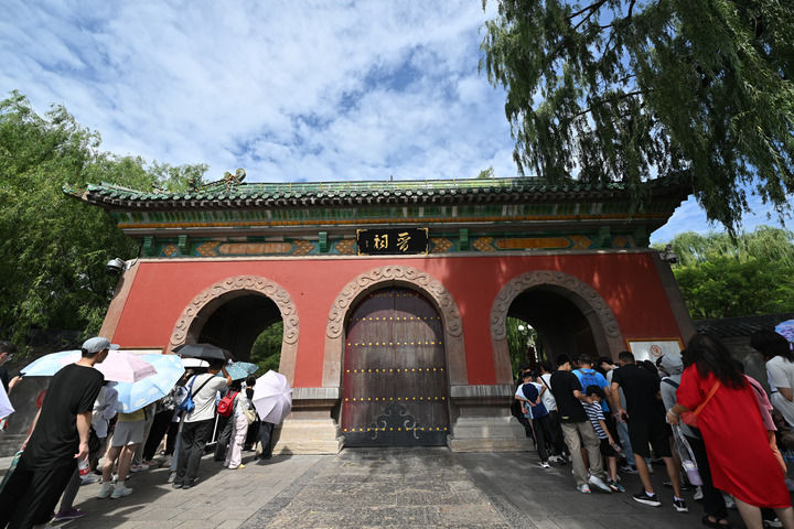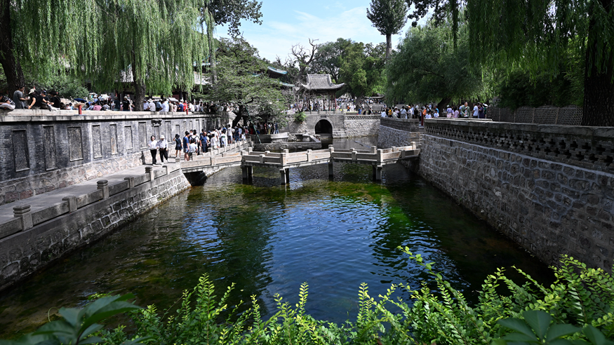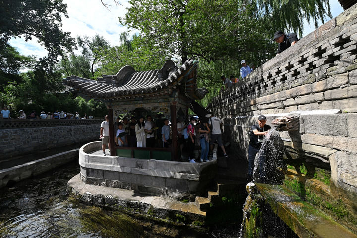 2025年8月7日,游客在晋祠难老泉排队观泉。新华社记者 詹彦 摄