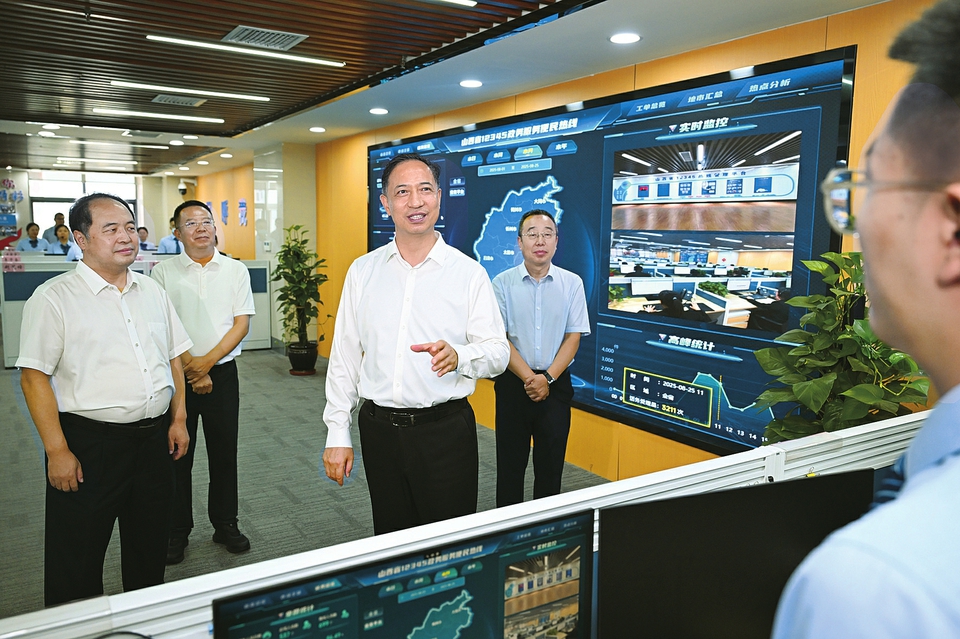 八月二十五日,省长卢东亮来到省政务服务中心,听取全省12345热线运行介绍,与工作人员交流,了解热线工单转办督办情况。(记者阮洋摄)