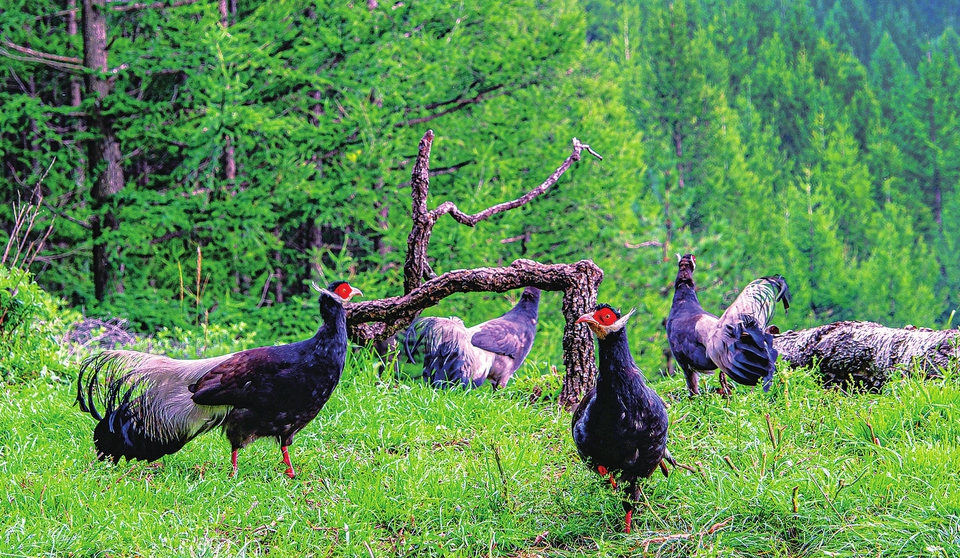 9月7日,一群褐马鸡在沁源县灵空山自然保护区内栖息、觅食。近年来,随着沁源县的生态环境不断优化,被誉为“东方宝石”的褐马鸡种群数量明显增加,呈现出活动区域面积不断扩大的趋势。(郭世虎摄)
