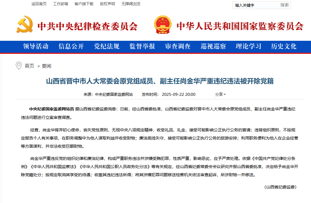 中央纪委国家监委网站讯 据山西省纪委监委消息:日前,经山西省委批准,山西省纪委监委对晋中市人大常委会原党组成员、副主任尚金华严重违纪违法问题进行立案审查调查。
