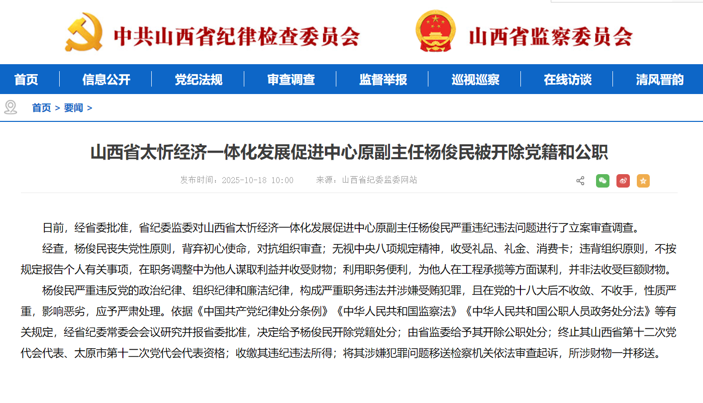 原标题:山西省太忻经济一体化发展促进中心原副主任杨俊民被开除党籍和公职