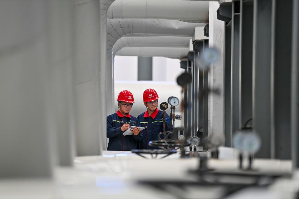 在太原市热力集团有限责任公司中继能源站,工作人员检查设备运行情况(10月19日摄)。